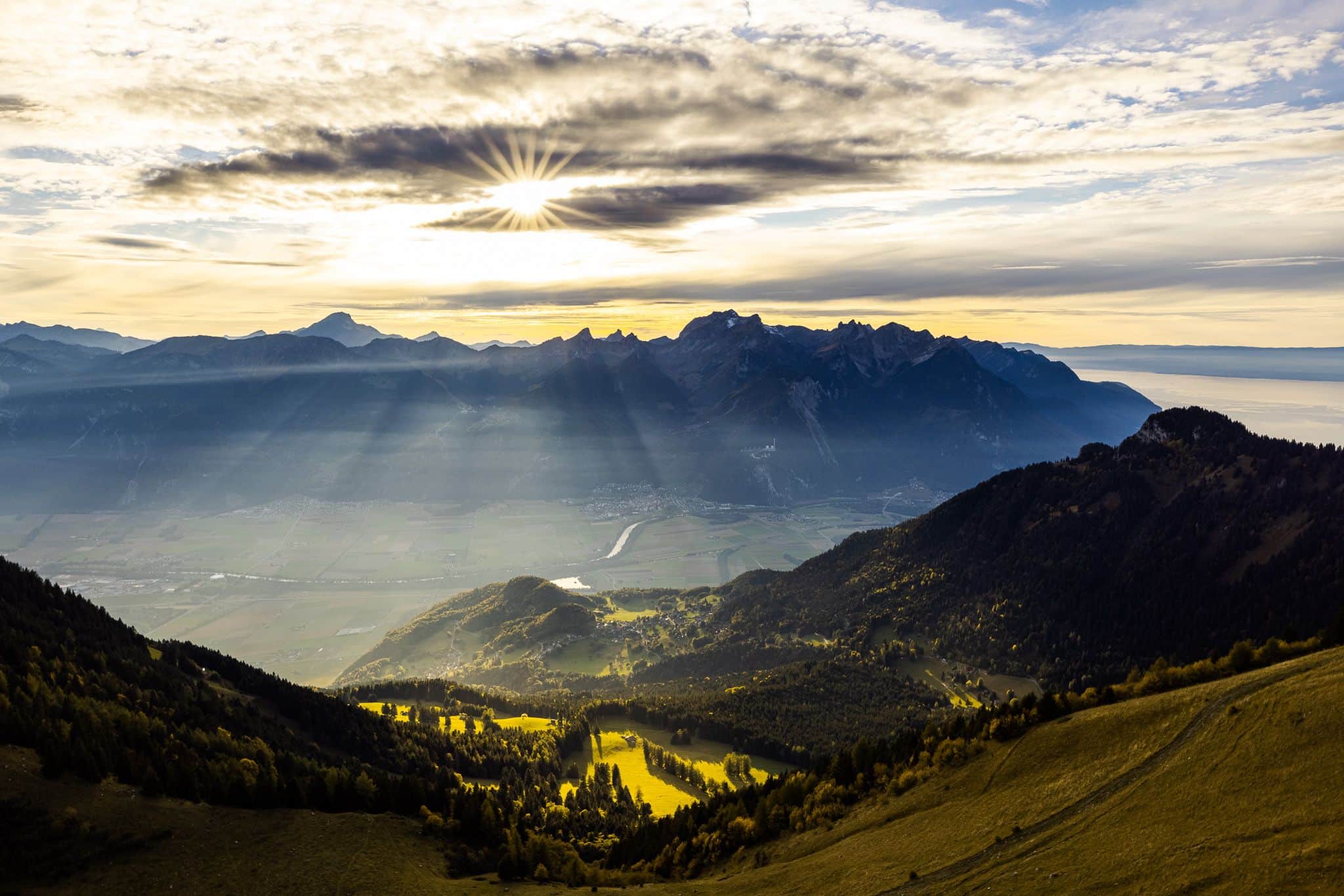 Shortly before we reach the Berneuse towering high above Leysin, there is already an unexpected opportunity to photograph a fairy-tale light atmosphere with light fog streaks and sunbeams breaking in it in the Rhône valley deep below. From more or less exposed positions, I can capture different variations of this mood with focal lengths between 50-200 mm. A motif that would be almost impossible to plan in advance, but spontaneously makes quite a bit. After all, who knows in advance that the factors of fog, visibility, sunlight and angle in combination with the overall motif from this location will fit together in such a way that ultimately a landscape photo of high quality is created?