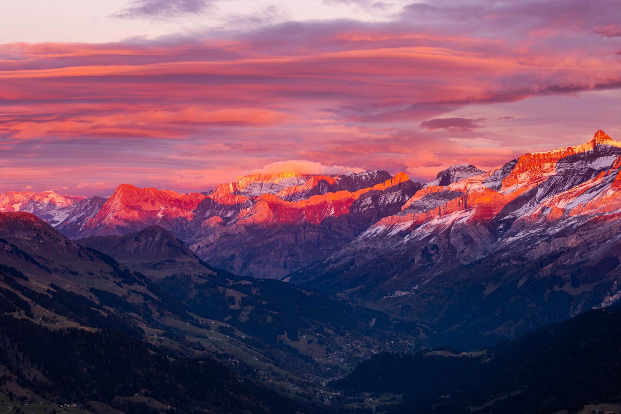 And when we already think we have seen everything, it begins: the alpenglow. And how! I have already seen a few times that the mountains glow and are illuminated in the last light almost kitschy-romantic reddish, but tonight hier on the Berneuse puts it all in the shade. As if that weren’t enough, there are also the perfect clouds in the sky that look like they’ve been painted, adding a certain drama to the whole scene. I can hardly keep up with the photographing. After five minutes, however, the spectacle is already over again and the night finally descends.