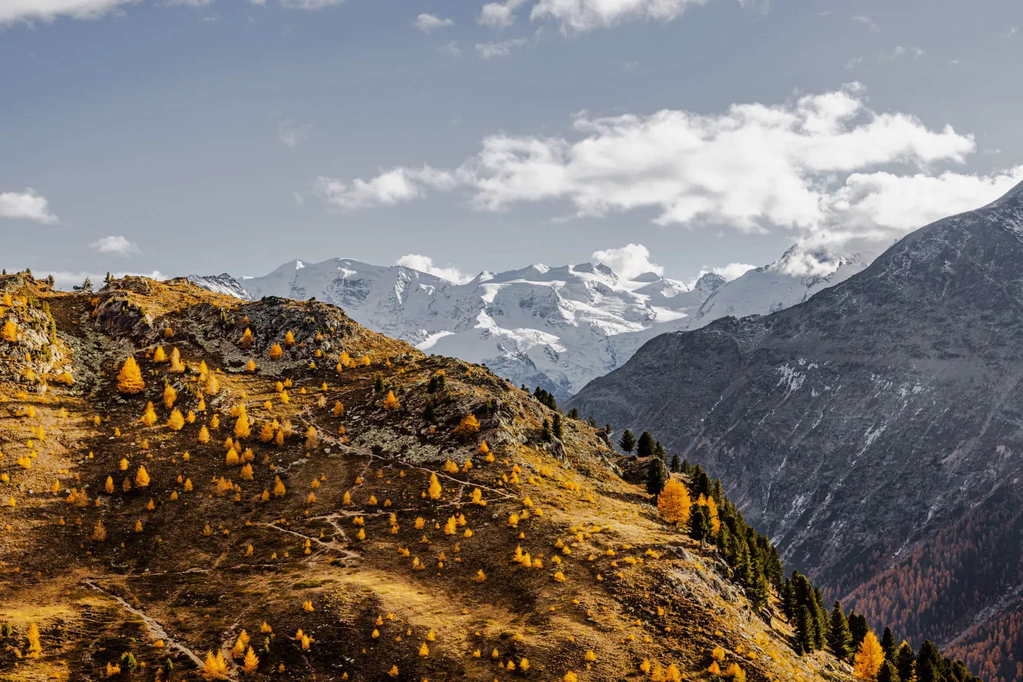 Descending, we move along the small high valley Val Languard to the alp of the same name, completely abandoned waiting for the winter season. We pass icy mountain streams, lonely watercourses and not a single person. As crowded as the Engadine is in summer and winter, there are seasons when you can have the breathtaking nature almost to yourself. After a few meters of altitude in golden-yellow larch forests, our route takes us through Pontresina to the train station. With the Rhaetian Railway we return in a few minutes to our starting point at the Diavolezza valley station, which we reach again about five hours after our departure.