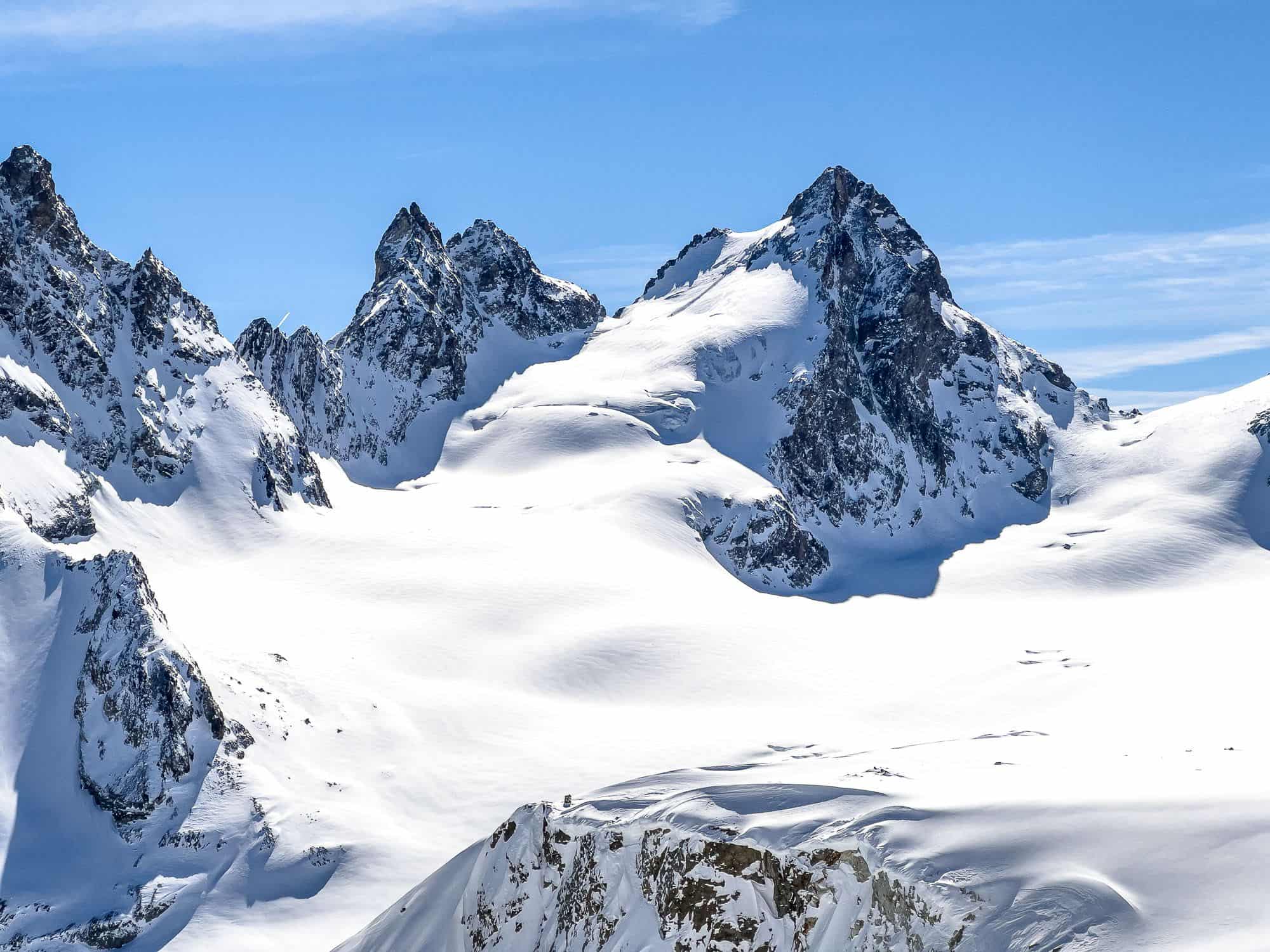 Der Himmel ist strahlend blau, erst gegen Spätnachmittag soll sich das Wetter verschlechtern. Windstille, Sonnenschein und angenehme, nicht zu warme und nicht zu kalte Temperaturen sorgen für einen entspannten Aufstieg hinauf zum Col des Vignettes auf 3'153 m Höhe. Gleiche Route, zwei Tage vorher: stollender Schnee unter den Fellen, Wut, Frust – das hatten wir doch schon einmal. Heute hingegen ist der Aufstieg mit den konstant kälteren Temperaturen kein Problem, das Phänomen stollender Felle tritt vor allem bei wechselnden Schneetemperaturen zwischen nassem, wärmerem Schnee hin zu kaltem Schnee auf (zum Beispiel beim Übergang von sonnigen zu schattigen Bereichen). Manchmal reichen aber auch schon kleinste Unterschiede in der Exposition eines Hanges, um den entscheidenden Unterschied zwischen Freude und Frust auszumachen.