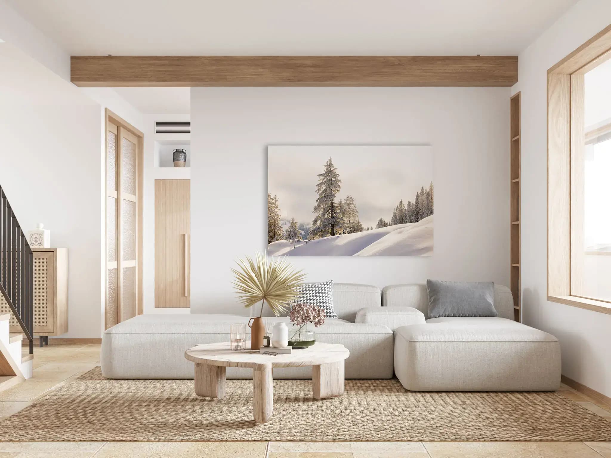 In this landscape, time seems to stand still, the world suspended in a perfect moment of harmony and peace. The trees, heavy with snow, are like guardians of an ancient forgotten world, standing in the silence of sleeping nature. No sound breaks the silence, only the soft whisper of the cool winter breeze gently caressing the glistening blanket of snow. This image is not only a visual but also an emotional journey into the depths of winter splendor, revealing in its simplicity a complex beauty that transcends the everyday and invites the mind to quiet contemplation.